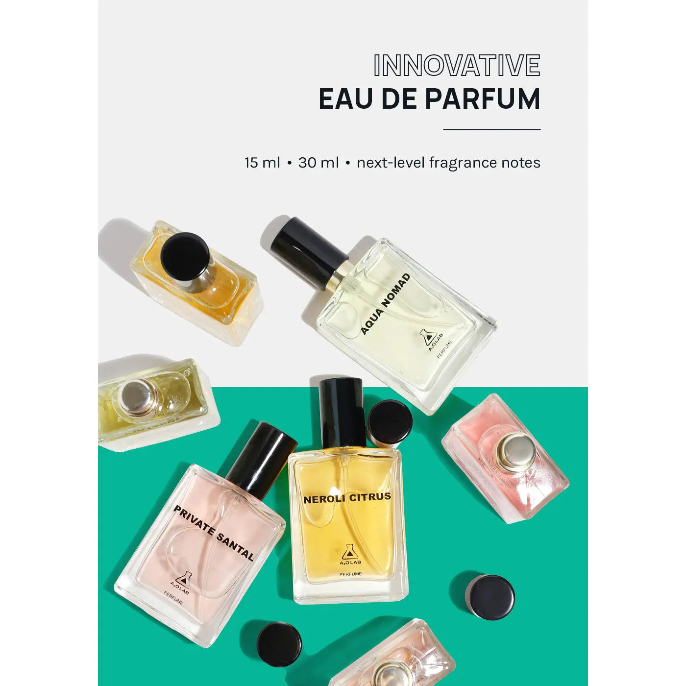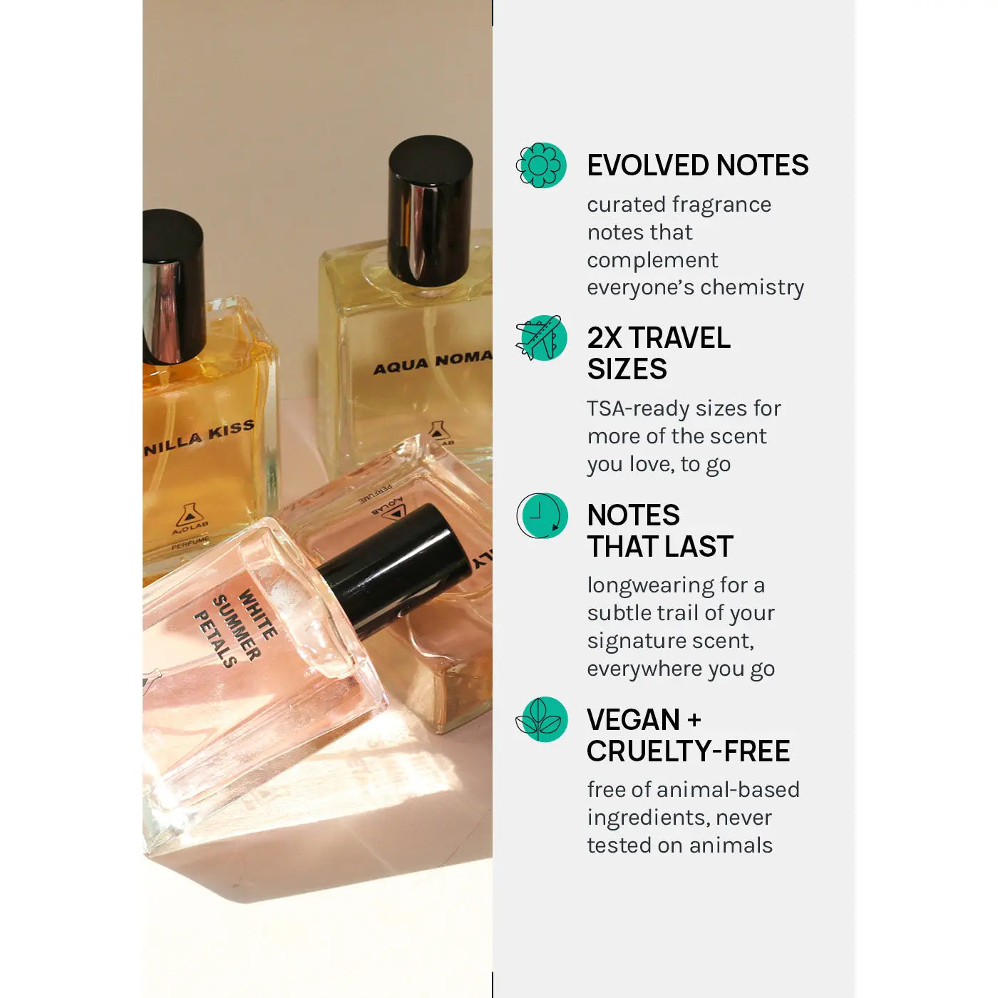 Available in two versatile sizes: a 15 ml travel size for scent on the go, + a 30 ml full size for daily indulgence.
